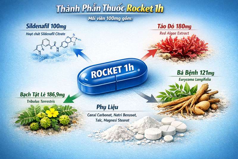 Rocket 1H là sự kết hợp giữa hoạt chất hỗ trợ cương dương nhanh và thảo dược thiên nhiên giúp bổ thận – tráng dương – duy trì phong độ lâu dài:
